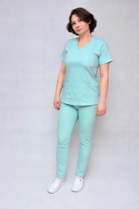 Spodnie medyczne miętowe- bardzo wygodne, dzięki dodatku Poliestru i Elastanu są elastyczne, dopasowują się do ciała oraz nie robią się na nich zagniecenia. Posiadają wyższy stan, co zwiększa komfort noszenia. Spodnie posiadają gumkę.